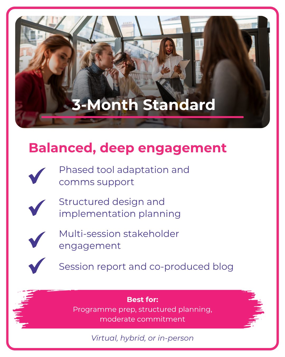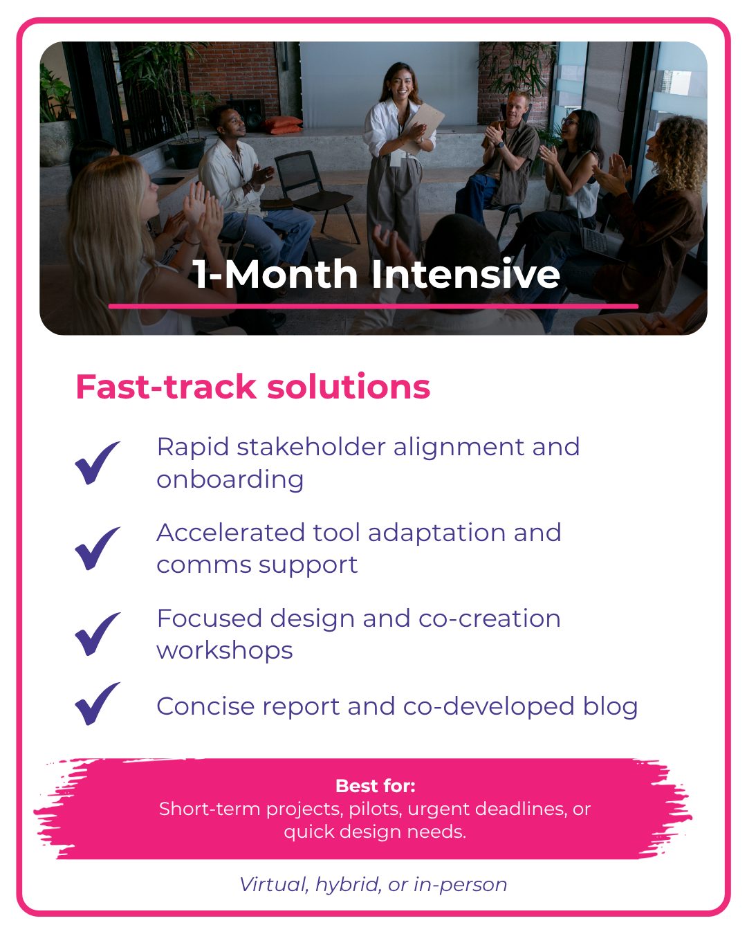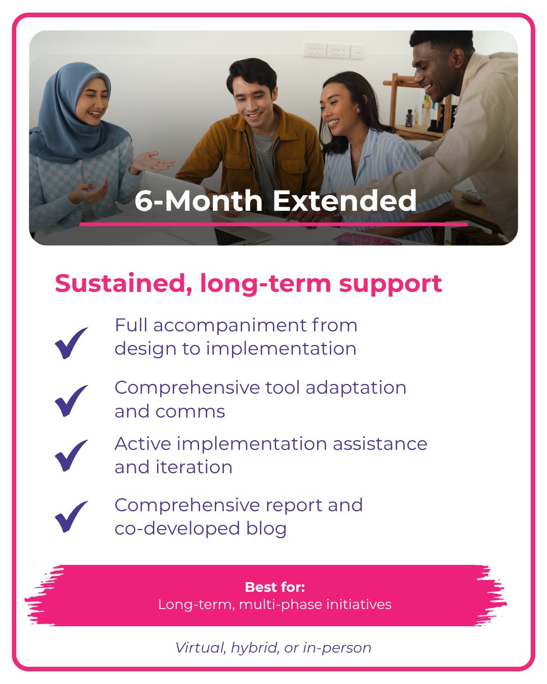 We provide 1-month, 3-month, and 6-month support packages, delivered virtually, in-person, or through hybrid formats. Each package follows our Action Learning CycleObserve, Assess, Design, Implement, and Capture — helping teams move from ideas to action through structured reflection and experimentation.