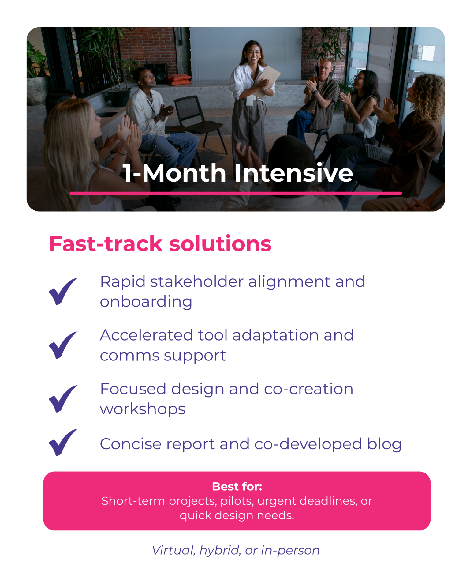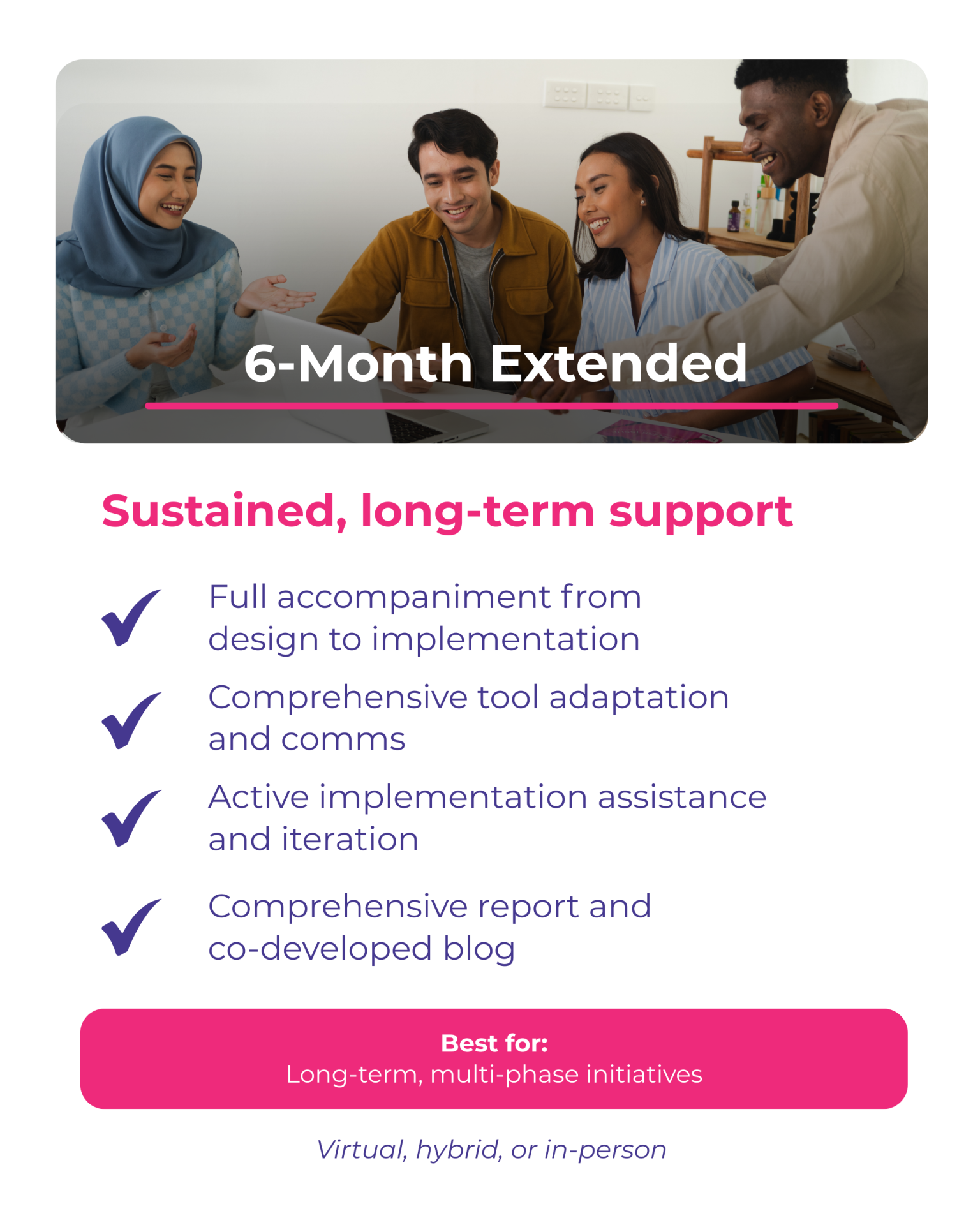 We provide 1-month, 3-month, and 6-month support packages, delivered virtually, in-person, or through hybrid formats. Each package follows our Action Learning Cycle — Observe, Assess, Design, Implement, and Capture — helping teams move from ideas to action through structured reflection and experimentation.